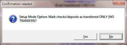 Selecting Yes will mark the checks and deposits as transferred in the Accounts Payable, Accounts Receivable and Payroll files/tables. It will not transfer any data into the Check Reconciliation Checkbook. This avoids having to manually clear many historical checks and deposits. It will not update the last transfer date. See Checklist A-1 in Starting Up a Checkbook chapter.