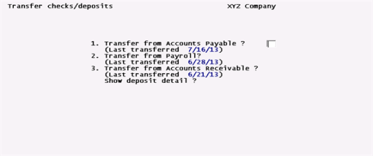 This selection can be run only if you have specified (in the Check Reconciliation Control information) to use one or more of these modules. See Check Reconciliation Control Information. You may transfer from one module at a time.
