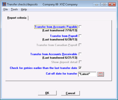 You have the choice of two methods of transferring checks and deposit information from Accounts Payable, Accounts Receivable and Payroll. The method you use is determined by your settings in the Check Reconciliation Control information. They are: