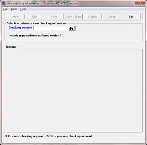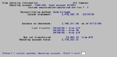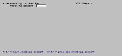 If only one checking account is in use and no other modules are interfaced with Check Reconciliation, no questions are asked and the information displays automatically.