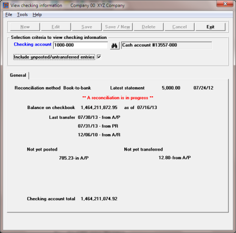 | • | the total amounts of entries in other modules that have not been posted or transferred to the Check Reconciliation (C/R) module. |
