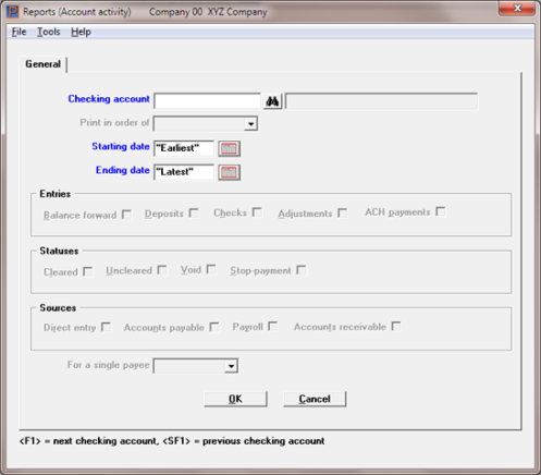For example, you could print a list of checks written to a specific payee and a list of which of those checks have cleared. Or you could print a report showing which entries originated from Accounts Payable, Payroll, or Accounts Receivable, or which entries you entered directly in C/R.
