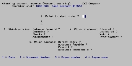 Enter the number of the checking account you want to print the report for, or use one of the options: