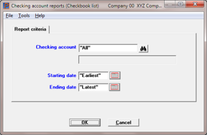 In graphical mode only, enter the checking account for which you want to print the report. You can also use the option:
