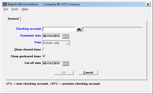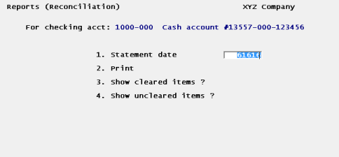 You may also enter a date of a previous reconciliation to print the cleared entries. In this case it is recommended that you do not check (or enter Y) the Show uncleared entries field.