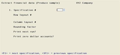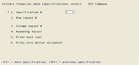 This function enables you to clear the Print next run run field for all Extract financial data specifications. If you do not want to unselect them all, you may unselect them individually from the Specifications, enter menu selection.