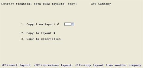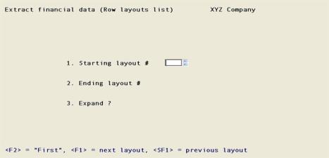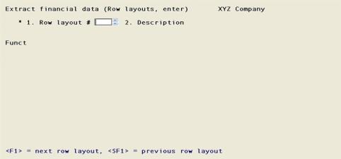 In the row layout design, you specify, line by line, which accounts are to be included in the financial data extraction file. You can intersperse various commands to control headings, totals, and other formatting functions. See Row Layouts, Enter.