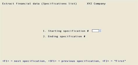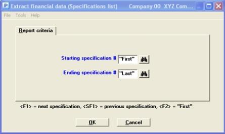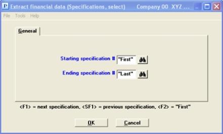 Make any needed changes. Select OK to print the Extract Financial Data Specifications List.