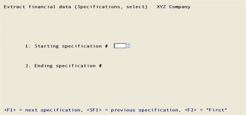 The selection function lets you turn on the Print next run field (field #5 in the Specifications: Enter selection) on all specifications at once, or on any range of specifications. This is merely a convenient alternative to setting the flag on each specification individually each time you want to generate that financial data file.