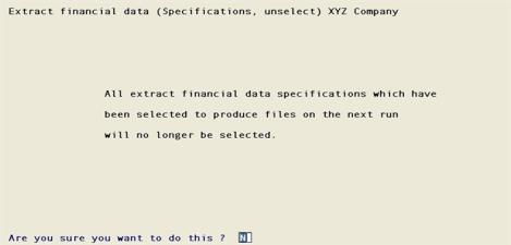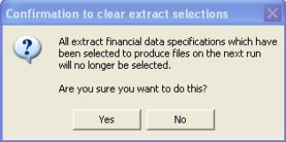 Select Yes to proceed to deselect all Extract financial data specifications, or No to cancel and return to the Extract financial data menu.
