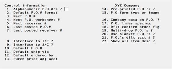 This selection allows you to set up the Purchase Order Controls. This contains basic information about the way you handle purchase orders in your company. The information in here controls various functions in the P/O module.