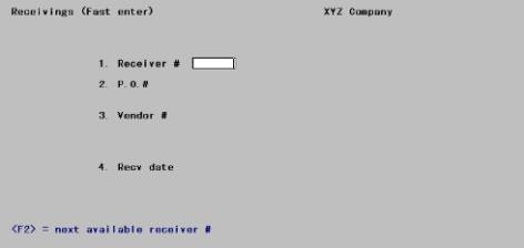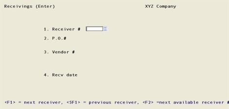 From this screen you can work with both new and existing receivings. If a receiving has already been entered for the receiver number you specify, it appears and the cursor is positioned at Field number to change ? for changes or deletion.