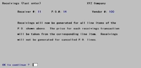 Fast entry accepts without question the quantities and costs on the purchase order, including the miscellaneous costs. If there has been no purchase order for this receiving, you cannot use Fast entry.