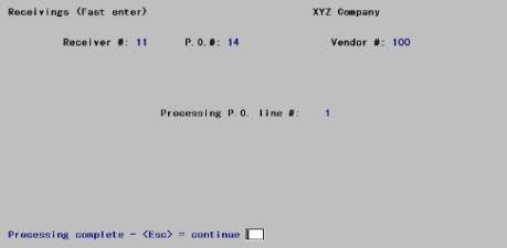 Upon pressing <Enter> with this field blank, there is a period of processing while the total costs are converted to unit costs and are pro-rated to the individual line items of the receiver according to their respective product costs. You are returned to the header screen to enter the next receiving.