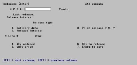 | • | If you have not specified a First reqd date for the purchase order, and if there have been no releases yet, this displays as NO RELEASES YET. The release you are about to enter will become release # 1. |