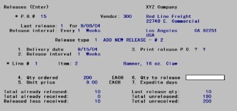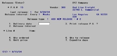 Use this selection to enter releases into the P/O module and to print release purchase orders to send to your vendors.
