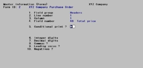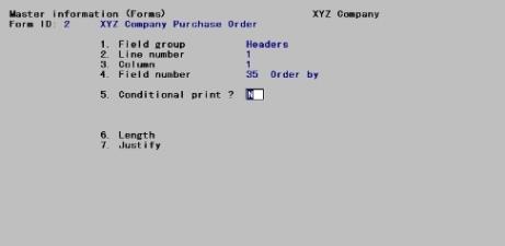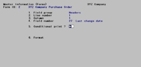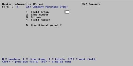Your response here will define the conditions under which this field will print on the purchase order. If you answer N, the content of the data field you selected will print without condition. If you answer Y, you will be prompted to define the condition, under which this data will be printed on the purchase order.