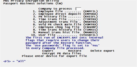 Use this utility to encrypt or unencrypt social security numbers and bank account numbers stored in payroll. It will also encrypt or unencrypt PBS user passwords.