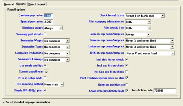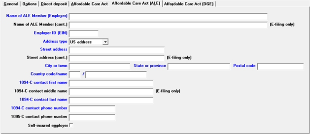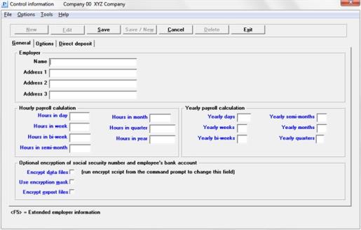 Data entered here updates two files/tables. The general Payroll control data is entered on the General, Options and Direct deposit tabs and is stored in PRCTLF (Payroll Control information). The data entered on the three Affordable Care Act tabs are stored in ACACTL (Affordable Care Act Control information).