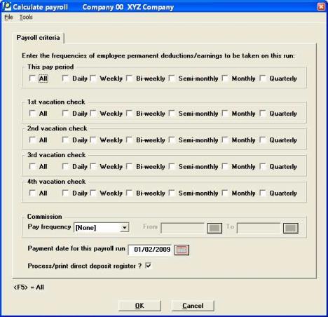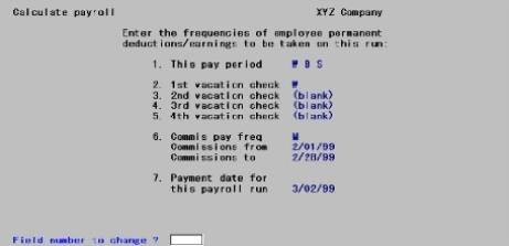 After you have completed entry of all time transactions for a payroll run, you must calculate the paycheck for each time transaction. This is done by selecting and running this selection, Calculate payroll. Before this selection can begin calculating, it must be told which categories of permanent deductions or earnings to invoke for that calculation run. You use the next screen to enter your selections.