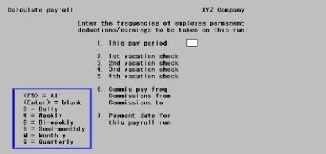 Enter the frequencies of permanent deductions/earnings applied in this payroll calculation for each of 5 checks. These 5 checks are for the current pay period (called THIS PAY PERIOD on the screen), and up to 4 weeks of vacation paid in advance. (For further information, refer to the description and example given for deduction/earning frequencies in Employees.)