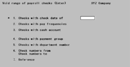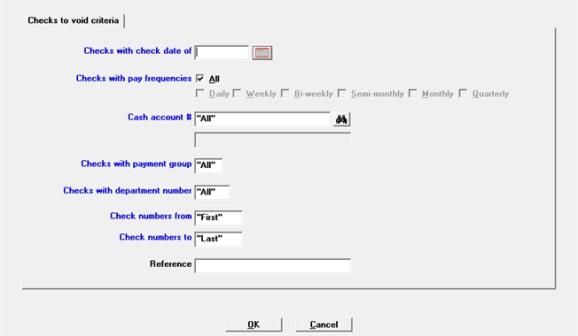 Enter whatever reference you want. Unlike the previous fields, this field is not used to select which checks to void. It will be used as the reference in the G/L transaction for each voided check.
