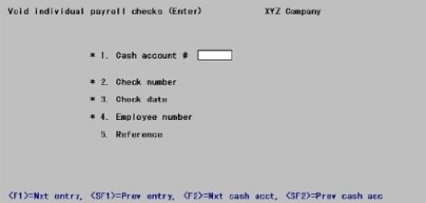 From this screen you can work with both new and existing void check entries, whether these originated by the Void individual payroll checks selection or the Void range of payroll checks selection.