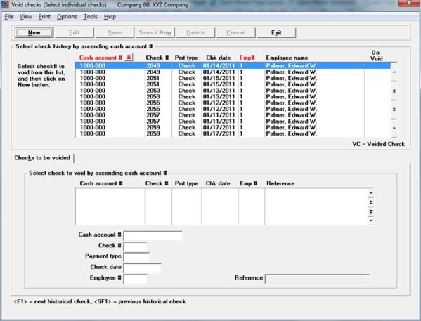 Payments that display in the upper list box are available for voiding. After selecting a check in the upper list box, click on the New button or enter <Alt+N> to indicate that the check is to be voided. Then it will display in the lower list box and you may edit the Reference field.