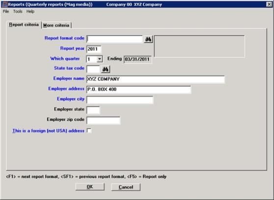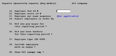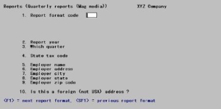 Enter the format code for the report you want to make. The report must previously have been entered and verified in Magnetic media formats, and moreover must have been defined as a quarterly report (rather than an annual one). You can use one of the options: