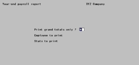 Leave the box unchecked or use the default of N to print a Year-End Payroll Report for "All" or to select only one employee, If "All" employees is selected an accumulation is reported for employee grand totals.