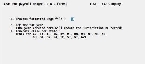 Run this selection at the end of the year to print the Year-End Payroll Report and handle your W-2, W-3 and 1099 processing.