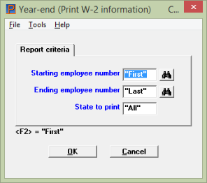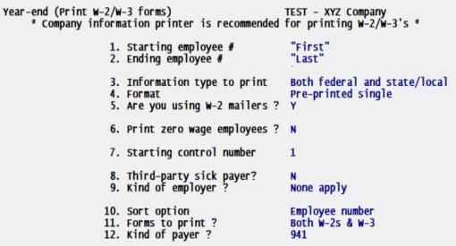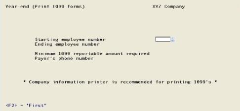 Non-employees and regular employees with no wages for the year will not print on the report. Non-employees should receive a Form 1099 based on the report covered in the Printing 1099 Information section.