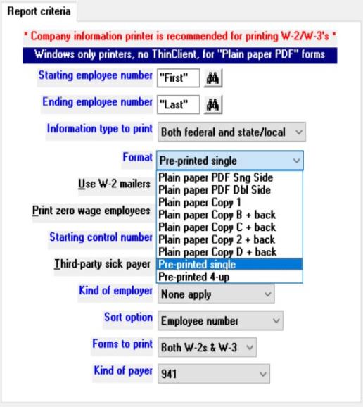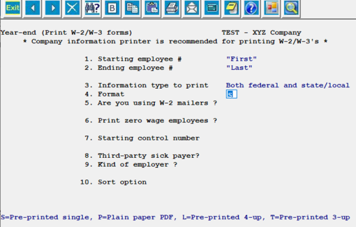 Print W-2 forms on preprinted, continuous or laser forms, or output them to a file for submission as a formatted wage file.
