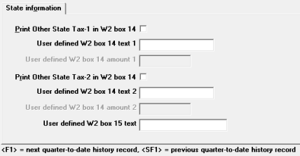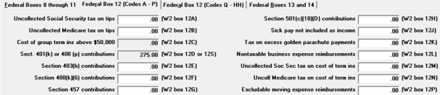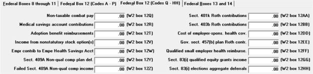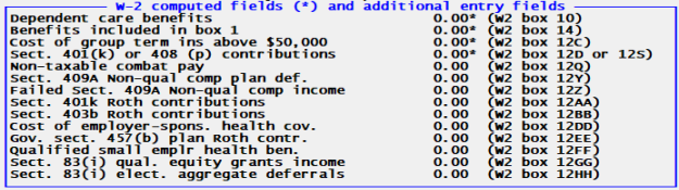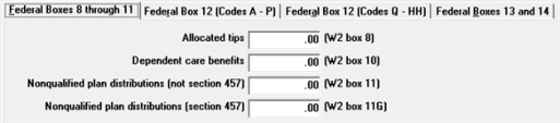 The tabs contains information entry fields that correspond to the W-2 form by box number. Refer to the IRS instructions for filling out W-2 forms for information on each of these fields. The IRS instructions refer to these fields by referencing the W-2 box number. Each field on the screen is followed by the corresponding W-2 box number.