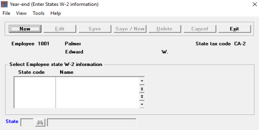 To locate a W-2 information entry, start typing an employee number. You may also use the up/down arrows, Page up, Page down, Home and End keys to locate an entry. The <F1> and <SF1> keys function the same as the up/down arrow keys.