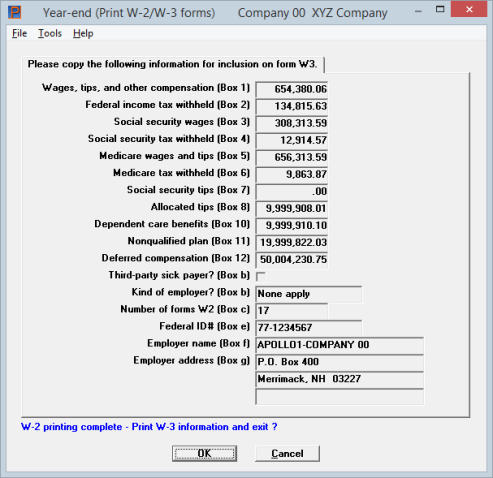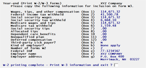 Additional information for W-2 reporting can be entered via the Enter W-2 information menu selection sound under the Year-end menu. This information is not included on this report. Use the Print W-2 information menu selection for that data.