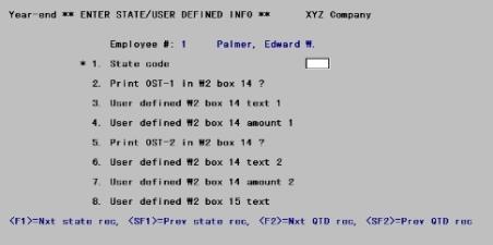 Many of these fields may not be applicable to your situation. In this case just press <Enter> for the field to set it to zero. In fact, after reviewing this screen and the next one, which can be used for state and federal information, if none of the fields are applicable to your reporting needs then you do not need to use this function at all. In this case all the information you are required to report has been accumulated for you within the main body of the PBS Payroll system.