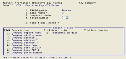 Consult with your bank contact person to determine if they want a header record in the positive pay file. These are the options: