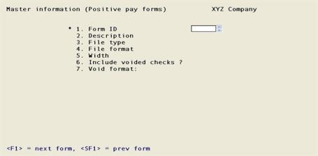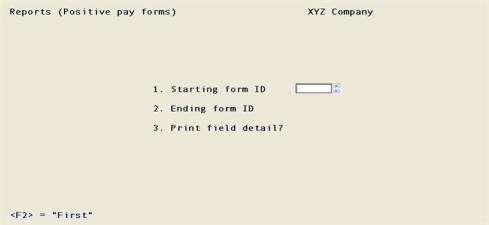 This selection prints a report that lists the positive pay forms you have defined. You may select to print a specific form type or all form types for the forms.
